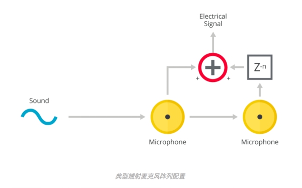 通過在所需聲源的方向布置一行麥克風(fēng)構(gòu)造端射麥克風(fēng)陣列,此時(shí)所需聲音會(huì)以不同的時(shí)間延遲到達(dá)各個(gè)麥克風(fēng)。每個(gè)麥克風(fēng)的處理電路都可以通過電子時(shí)間延遲補(bǔ)償麥克風(fēng)的音頻時(shí)間延遲。端射麥克風(fēng)陣列和垂射麥克風(fēng)陣列相似,因?yàn)閬碜运璺较虻男盘柲軌蚍e極求和,但來自其他方向的信號求和值則較低。