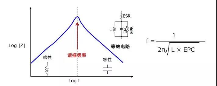 在理想電感器中,阻抗隨著頻率的提高而呈線性增加,但在實(shí)際的電感器中,如等效電路所示,并聯(lián)存在寄生電容EPC,因而會(huì)產(chǎn)生自諧振現(xiàn)象。