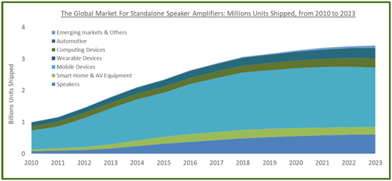 1 資料來(lái)自SAR Insight & Consulting首席研究員Peter Conney于2017年第4季度發(fā)布的音頻功率放大器報(bào)告:市場(chǎng)增長(zhǎng)、通道數(shù)量、放大器類型、輸入類型、類、喇叭保護(hù)。更新數(shù)據(jù)來(lái)自SAR Insight & Consulting于2019年第1季度發(fā)布的音頻信號(hào)鏈IC預(yù)測(cè)DATAbase。