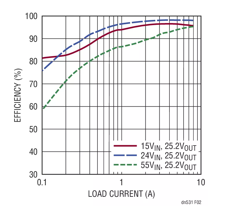 轉(zhuǎn)換器以一個(gè)可編程的恒定開(kāi)關(guān)頻率運(yùn)作,該頻率處于 50kHz 至 500kHz 的范圍內(nèi),采用一個(gè)電阻來(lái)設(shè)定 (R13 = 100k,250kHz)。圖 1 示出的這款解決方案能夠?yàn)橄到y(tǒng)負(fù)載提供高達(dá) 8A (VOUT= 25.2V)。如圖 2 所示,滿負(fù)載效率 (IOUT = 8A,VIN = 24V) 可達(dá) 98% 以上。