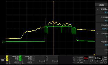 例如文章一開始提到的,某電機(jī)控制板的24V電源在給電機(jī)供電的同時(shí)也通過(guò)DC/DC:MP2451輸出12V給其他電路供電。在沒(méi)有助力電池時(shí),電機(jī)發(fā)電為控制板供電,而電機(jī)的轉(zhuǎn)動(dòng)并非是勻速的,產(chǎn)生了波動(dòng)較大的電壓,如下圖1所示,黃色線為電機(jī)反向發(fā)電電壓,綠色則為MP2451輸出的電壓。