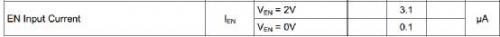 需要注意的是RC中的電阻也不能過(guò)大,要滿足EN引腳所需的電流需求。如下圖所示為某電源芯片手冊(cè)中EN輸入電流條件。