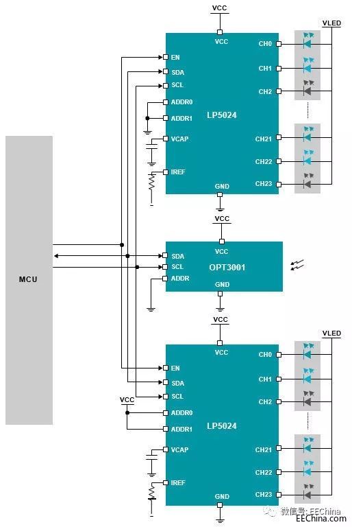 如圖 6 所示,各種LED 環(huán)形燈照明圖案參考設(shè)計(jì)說明了如何使用裝有集成式LED 引擎的新型多通道RGB LED 驅(qū)動(dòng)器設(shè)計(jì)多色RGB LED 環(huán)形燈圖形子系統(tǒng)。使用環(huán)境光傳感器 IC 可自動(dòng)控制LED 亮度。