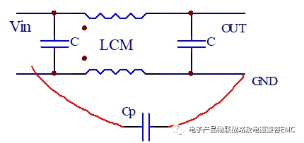 當(dāng)電子線路中有共模電感的濾波設(shè)計(jì)時(shí),前后級進(jìn)行PCB鋪地銅設(shè)計(jì)時(shí)TOP層的走線與BOTTOM底層的PCB鋪地就會存在耦合電容Cp;高頻的騷擾信號就會通過耦合電容影響共模電感的噪聲阻抗性能;等效電路如下: