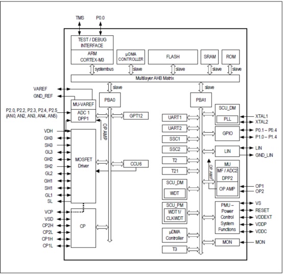 It includes six fully integrated NFET drivers optimized to drive a 3-Phase motor via six external power NFETs, a charge pump enabling low voltage operation and programmable current along with current slope control for optimized EMC behavior. Its peripheral set includes a current sensor, a successive approximation ADC synchronized with the capture and compare unit for PWM control and 16-bit timers. A LIN transceiver is also