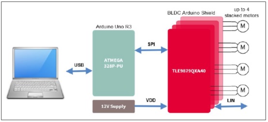 圖4. TLE9879 BLDC Arduino馬達(dá)控制板簡(jiǎn)化應(yīng)用框圖