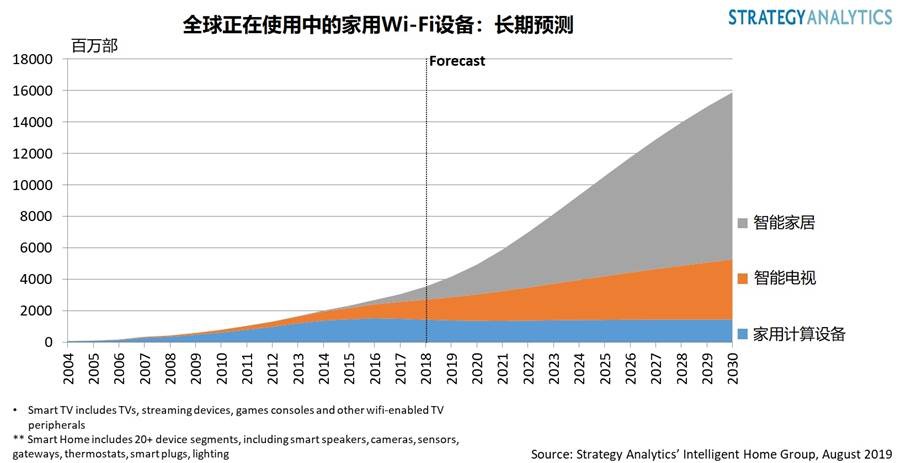 支持Wi-Fi的智能家居設(shè)備(如智能音箱、智能家電、攝像機(jī)和恒溫器)的增長將成為無線家庭發(fā)展的第三次浪潮。 這開始于二十一世紀(jì)初的家用計算設(shè)備,緊隨其后的是智能電視設(shè)備。 2019年,智能電視設(shè)備將占所有使用中的家庭Wi-Fi設(shè)備的29%;但到2020年將被智能家居設(shè)備所取代,最終將占使用中Wi-Fi設(shè)備的60%以上。
