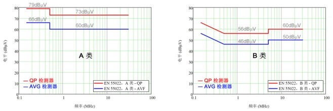 圖 1:使用準(zhǔn)峰值和平均值檢測器的 EN 55022 A 類和 B 類傳導(dǎo)發(fā)射限值。