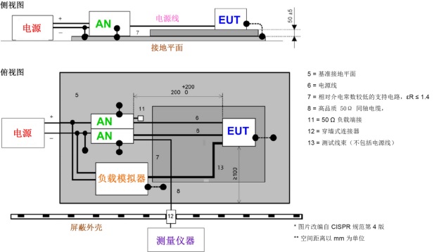 AN 直接安裝在基準(zhǔn)接地平面之上,AN 外殼與接地平面相連。電源回流線還與電源和 AN 之間的接地平面相連。將 EMI 接收器連接到相應(yīng) AN 的測量端口可確保成功測量每條電源線上的傳導(dǎo)發(fā)射。與此同時,插入另一條電源線的 AN 的測量端口端接 50Ω 負(fù)載。