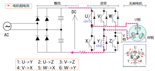 下圖表示了無刷電機(jī)梯形波控制算法的基本原理。首先,交流電整流為直流電壓,后級(jí)為變頻部分(inverter),包含6個(gè)開關(guān)器件(FET):上橋臂的U、V、W和下橋臂的X、Y、Z。