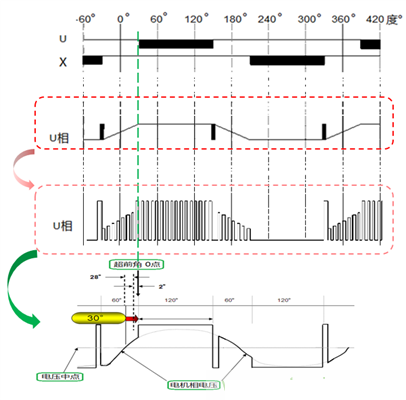 在無刷直流電機(jī)(BLDC - BrushLess DC)控制里經(jīng)常會(huì)用到Lead Angle,即超前角/導(dǎo)通角。因?yàn)殡姍C(jī)線圈是感性負(fù)載,所以相對(duì)于線圈上的加載電壓,線圈里的電流會(huì)有一定的時(shí)延,從而影響電機(jī)的效率和產(chǎn)生噪音。以電機(jī)U相電壓舉例,把上圖PWM信號(hào)U、X和U相電壓波形放大,如下圖。其中U相展開可看到實(shí)際電壓波形,內(nèi)含PWM載波。忽略PWM載波看包絡(luò)圖,如下圖3最下面波形所示。