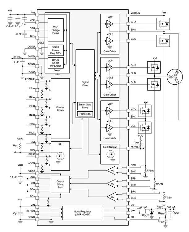 圖 3:高集成度柵極驅(qū)動(dòng)器(如 TI 的 DRV8323R)可以減少系統(tǒng)元件數(shù)量,降低成本和復(fù)雜性,同時(shí)節(jié)省空間。(圖片來(lái)源:Texas Instruments)