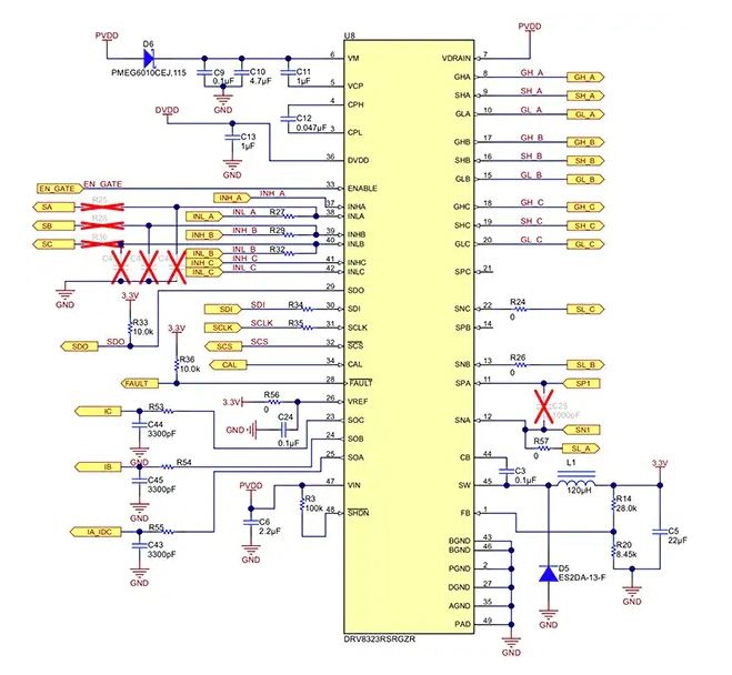 圖 5:DRV8323R 柵極驅(qū)動(dòng)器應(yīng)用電路。應(yīng)盡量減少跡線長(zhǎng)度,以限制 EMI。(圖片來(lái)源:Texas Instruments)