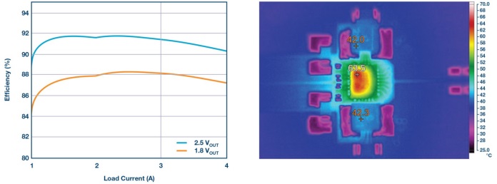 圖2.效率曲線(左)和熱圖像(右)。條件:VIN = 5 V,自然對(duì)流。