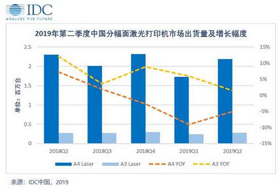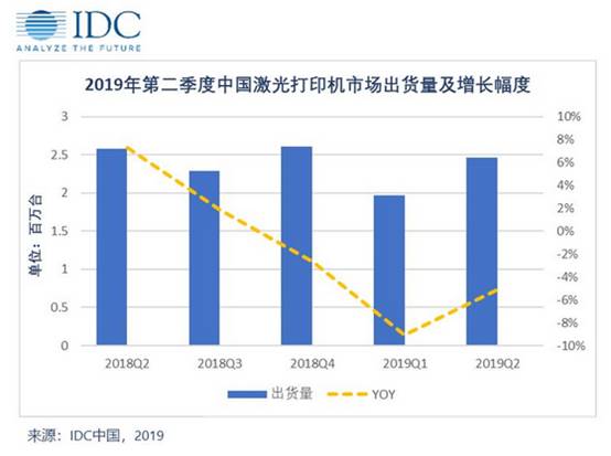 IDC《中國打印機(jī)市場季度跟蹤報(bào)告》顯示,自2018年第四季度開始,中國激光打印機(jī)市場呈現(xiàn)持續(xù)下滑態(tài)勢。2019年第二季度,激光打印機(jī)出貨量近247萬臺(tái),同比下降4.4%。受經(jīng)濟(jì)大環(huán)境下行及政府政策的影響,用戶出于成本控制或觀望政策走向的考慮,采購需求有明顯下滑。