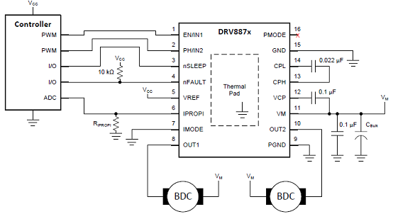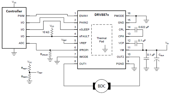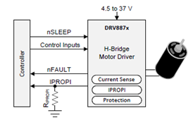 The DRV887x family of devices are flexible motordrivers for a wide variety of end applications. Thedevices integrate an N-channel H-bridge, chargepump regulator, current sensing and regulation,current proportional output, and protection circuitry.