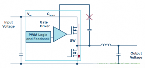 【圖2. 使用自舉電阻減慢異步降壓轉換器中的開關轉換!