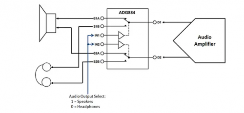 圖 2:該基本電路使用單個(gè) Analog Devices ADG884 在兩個(gè)音頻輸出設(shè)備之間切換