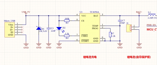 這款TC4056A也是市面上比較常見的一款單節(jié)鋰電池充電管理芯片,充電電壓固定在4.2V,最大充電電流可大1A,同時自帶鋰電池溫度檢測、欠壓閉鎖、自動再充電和兩個用于指示充電、結(jié)束的LED狀態(tài)引腳。眼尖的高手們或許發(fā)現(xiàn)了筆者電路上的一個問題,那就是,鋰電池充電部分并沒有帶保護(hù)電路,是不是有安全隱患?其實不然,因為筆者使用的電池是鋁包電池,而非18650那種鋰電池,這種鋁包電池本身就已經(jīng)帶了保護(hù)板,所以筆者也就沒有再多此一舉了,那樣也浪費物料。