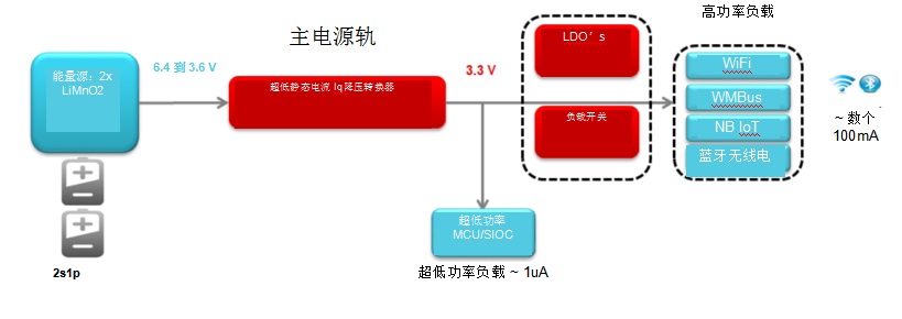 例如,假設(shè)有兩節(jié)鋰-二氧化錳(Li-MnO2)電池為智能電表供電。Li-MnO2電池是一次性非充電電池,由于使用壽命較長(長達(dá)20年),再加上比鋰亞硫酰氯電池更具成本效益,其在智能電表或水表中的應(yīng)用日益廣泛。
