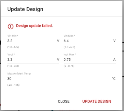 由于最小VIN低于VOUT,設(shè)計(jì)更新失敗。此設(shè)計(jì)未通過WEBENCH的首檢。