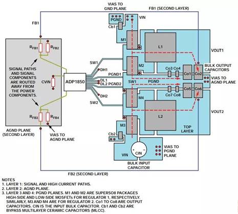 作為例子的開關(guān)調(diào)節(jié)器布局采用雙通道同步開關(guān)控制器 ADP1850,第一步是確定調(diào)節(jié)器的電流路徑。然后,進(jìn)行物理規(guī)劃和電源器件的考慮。此外,我們需要了解一點(diǎn):電流路徑?jīng)Q定了器件在該低噪聲布局布線設(shè)計(jì)中的位置。