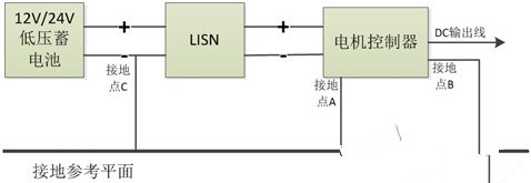 圖6、測試系統(tǒng)模型圖(接地點(diǎn)C是測試標(biāo)準(zhǔn)要求的:低壓蓄電池負(fù)極接地)
