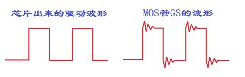 我們測死MOS管GS波形時,有時會看到下圖中的這種波形,在芯片輸出端是非常好的方波輸出,但一旦到了MOS管的G極就出問題了,有振蕩,這個振蕩小的時候還能勉強過關(guān),但是有時候振蕩特別大,看著都教人擔(dān)心會不會重啟。