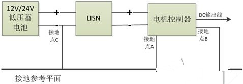 圖6、測試系統(tǒng)模型圖(接地點C是測試標準要求的:低壓蓄電池負極接地)