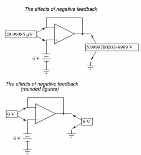 這個電路很快就會達到一個穩(wěn)定狀態(tài),輸出電壓的幅值會很準確的維持運放兩個輸入端之間的壓差,這個壓差Ve反過來會產(chǎn)生準確的運放輸出電壓的幅值。將運放的輸出與運放的反相輸入端連接起來,這樣的方式被稱為負反饋,這是使系統(tǒng)達到自穩(wěn)定的關(guān)鍵。這不僅僅適用于運放,同樣適用于任何常見的動態(tài)系統(tǒng)。這種穩(wěn)定使得運放具備工作在線性模式的能力,而不是僅僅處于飽和的狀態(tài),全“開”或者全“關(guān)”,就像它被用于沒有任何負反饋的比較器一樣。