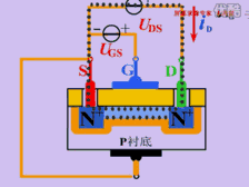 如果進(jìn)一步提高UGS電壓,使UGS達(dá)到某一電壓UT時(shí),P襯底表面層中空穴全部被排斥和耗盡,而自由電子大量地被吸引到表面層,由量變到質(zhì)變,使表面層變成了自由電子為多子的N型層,稱為“反型層”,MOS管工作原理動(dòng)畫圖2—55(b)所示。