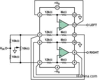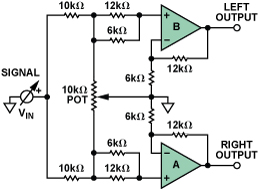 本電路中,信號(hào)通過(guò)10 kΩ串聯(lián)電阻在兩個(gè)放大器之間分配。兩個(gè)同相輸入端之間插入一個(gè)游標(biāo)接地的電位計(jì)。電位計(jì)和10 kΩ電阻的組合構(gòu)成一個(gè)輕負(fù)載,很容易被大多數(shù)信號(hào)源驅(qū)動(dòng)。放大器的增益配置為3。當(dāng)電位計(jì)游標(biāo)位于任一端時(shí),一個(gè)輸入端接地,因此不會(huì)有信號(hào)傳送至對(duì)應(yīng)的輸出端。另一輸入端的