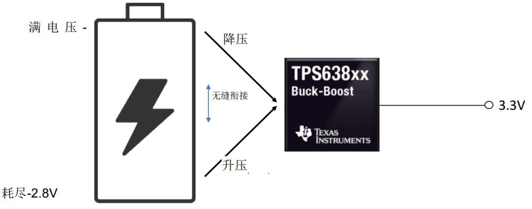 例如,假設要使一個典型電壓范圍為4.2V到2.8V的鋰離子電池提供3.3V的輸出電壓,如果使用降壓轉換器,那么電池的截止電壓必須大于3.3V,缺點則是無法有效利用電池中存儲的電能。而降壓-升壓轉換器有助于充分利用電池的所有電能,因為當輸入電壓等于或低于3.3V時,降壓-升壓轉換器還可以消耗存儲的電能,如圖2所示。
