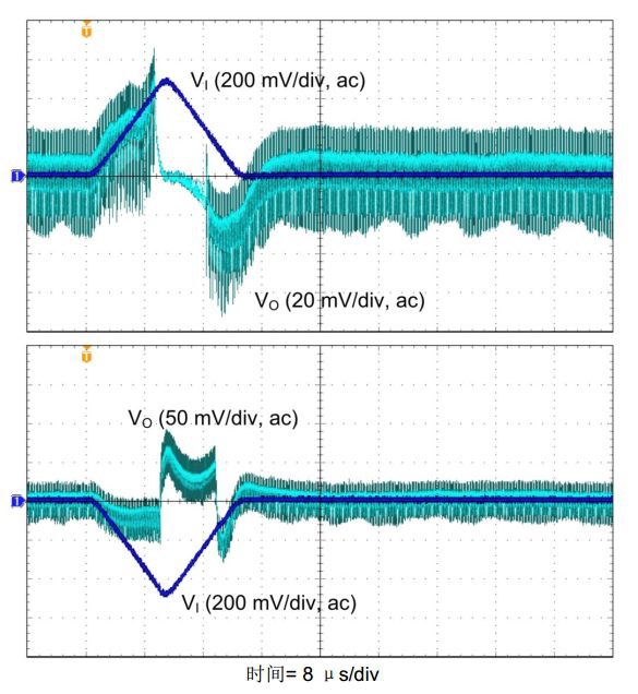圖3:TPS63802在VI = VO = 3.3V, ΔVI = ±0.5V時的線路瞬態(tài)響應