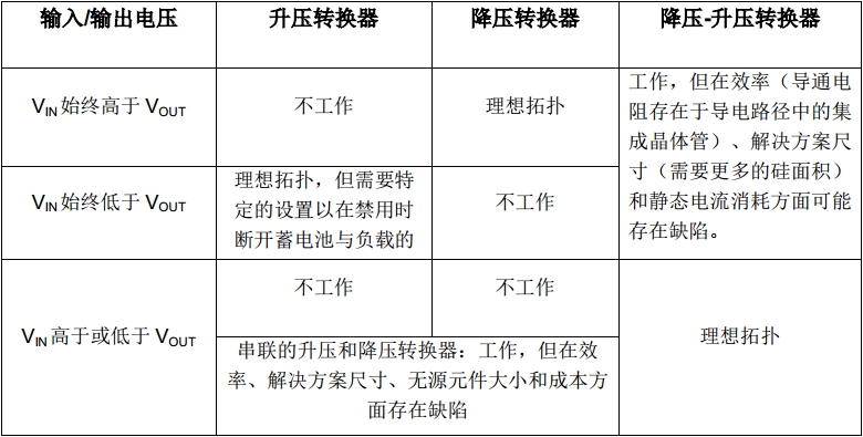 - 降壓-升壓可以在關機期間斷開負載與電源的連接,而其他拓撲可能需要額外的負載開關。
