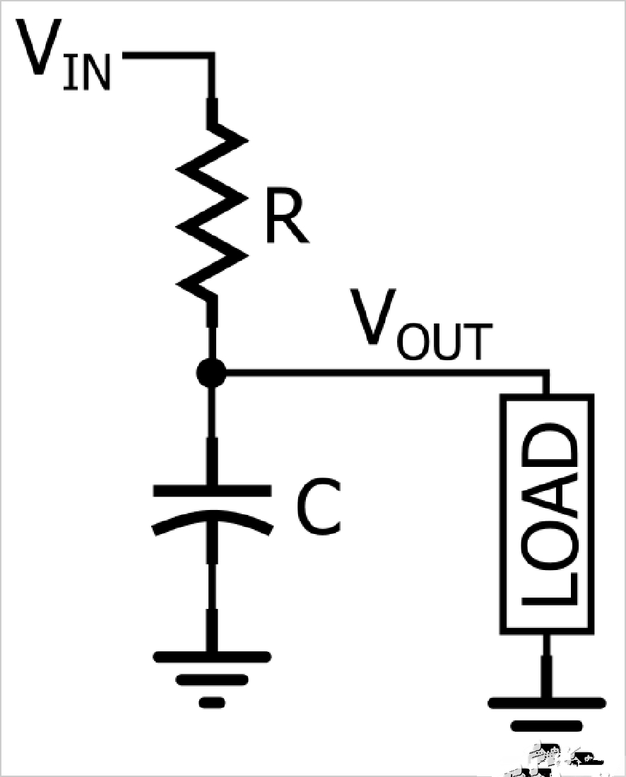 如圖所示,通過將一個電阻與信號路徑串聯(lián),并將一個電容與負(fù)載并聯(lián), 可以產(chǎn)生RC低通響應(yīng)。在圖中,負(fù)載是單個組件,但在實(shí)際電路中,它可能更復(fù)雜,例如模擬到數(shù)字轉(zhuǎn)換器,放大器或示波器的輸入級,用于測量濾波器的響應(yīng)。