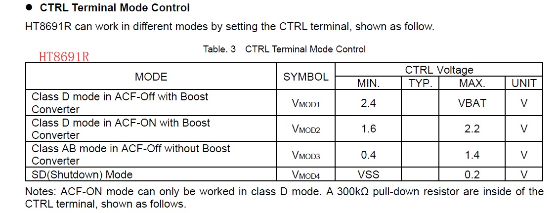 比如:都工作在防破音模式,HT8691是1.1V左右,HT8691R是2V左右。4. 放大倍數(shù)(增益)設(shè)置區(qū)別: