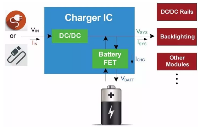 充電IC是基于電池和系統(tǒng)負(fù)載之間的連接方式的不同,系統(tǒng)負(fù)載可以由輸入電源供電,也可以由電池供電,或者由兩者同時(shí)供電。那么電池IC就必須具備功率管理功能,來實(shí)現(xiàn)系統(tǒng)負(fù)載功率來源的選擇。