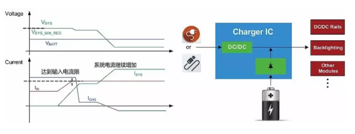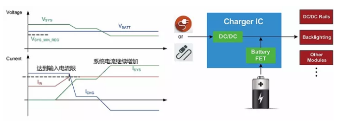 在以上的充電過程中,當(dāng)總的系統(tǒng)負(fù)載需求超過輸入電源的能力時(shí),系統(tǒng)母線電壓會(huì)下跌,充電IC就會(huì)減少充電電流以保證總的負(fù)載功率不再繼續(xù)增加,從而穩(wěn)定系統(tǒng)電壓不再下跌,維持系統(tǒng)負(fù)載的平穩(wěn)運(yùn)行。