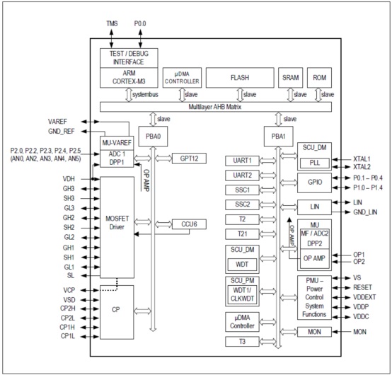 This highly integrated circuit contains analog and digital functional blocks. An embedded 32-bit microcontroller isavailable for system and interface control. On-chip, low-dropout regulators are provided for internal and externalpower supply. An internal oscillator provides a cost effective clock that is particularly well suited for LINcommunications. A LIN transceiver is available as a communication interface. Driver stages for a Motor Bridge orBLDC Motor Bridge with external MOSFET are integrated, featuring PWM capability, protection features and acharge pump for operation at low supply voltage. A 10-bit SAR ADC is implemented for high precision sensormeasurement. An 8-bit ADC is used for diagnostic measurements.