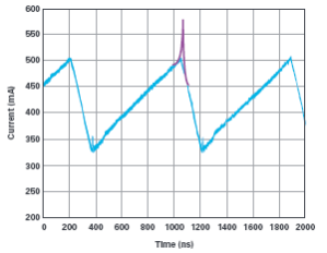 圖 3 顯示了通過與所用示波器兼容的電流探頭檢測到的開關(guān)電源的電感電流(藍色)的測量結(jié)果。除了顯示為藍色的測量結(jié)果之外,還添加了紫色標(biāo)記,它指示當(dāng)電感開始接近峰值電流進入過度飽和時,流過電感的電流狀況。當(dāng)選擇的電感對于給定的應(yīng)用不能提供足夠的額定電流時,就會發(fā)生這種情況。在開關(guān)電源中進行電感電流測量的主要原因之一是,它可以幫助識別是否正確選擇了電感,或者在工作中或故障情況下是否會出現(xiàn)電感飽和。