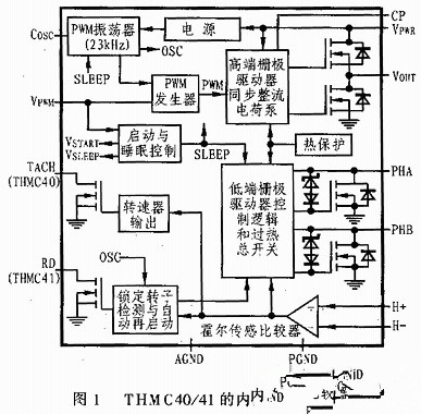 THMC40/41驅(qū)動器內(nèi)部由23kHz PWM振蕩器、PWM產(chǎn)生器、轉(zhuǎn)速器、高端柵極驅(qū)動器、低端柵極驅(qū)動器、霍爾傳感比較器、啟動和睡眠檢測電路、鎖定轉(zhuǎn)子檢測與自動再啟動電路、熱管理電路、高低端開關(guān)、同步開關(guān)電路以及電源電路等部分構(gòu)成,圖1所示其內(nèi)部結(jié)構(gòu)框圖。