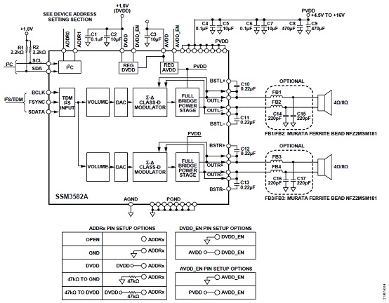The SSM3582A is a fully integrated, high efficiency, digital input stereo Class-D audio amplifier. The device can operate from a single supply and requires only a few external components, significantly reducing the circuit bill of materials.