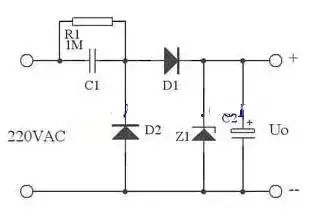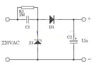 下圖為阻容降壓的典型應(yīng)用,C1為降壓電容,R1為斷開(kāi)電源時(shí)C1的泄放電阻,D1為半波整流二極管,D2在市電的負(fù)半周為C1提供放電回路,否則電容C1充滿(mǎn)電就不工作了,Z1為穩(wěn)壓二極管,C2為濾波電容。輸出為穩(wěn)壓二極管Z1的穩(wěn)定電壓值。