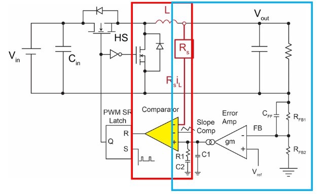 圖 1為DC/DC變換器的傳統(tǒng)電流模式架構(gòu)圖,它采用的方式是將采樣電流(紅色部分)與電壓反饋環(huán)路中誤差放大器的輸出(藍(lán)色部分)進(jìn)行比較,以生成控制MOSFET的PWM脈沖。