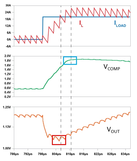 圖 2 顯示了誤差放大器延遲對環(huán)路瞬態(tài)響應(yīng)的影響。在這個(gè)示例中,負(fù)載電流從0A快速上升到20A,從底部曲線可以看到,VOUT在恢復(fù)之前出現(xiàn)了明顯的下降。綠色曲線為誤差放大器的輸出曲線,在最大下沖發(fā)生后的兩個(gè)周期內(nèi),它才達(dá)到最大值。此種延遲由誤差放大器的低通濾波器引起。