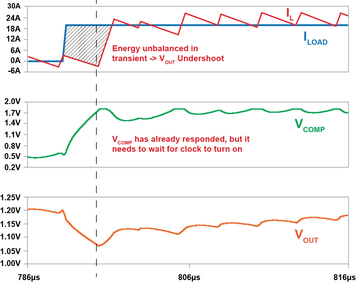 第二個(gè)因素為內(nèi)部時(shí)鐘引起的開關(guān)周期延遲,內(nèi)部時(shí)鐘將脈寬調(diào)制(PWM)控制反饋至輸出MOSFET。在連續(xù)電流控制工作模式下,由于其控制頻率是固定的,所以MOSFETs的導(dǎo)通時(shí)序由時(shí)鐘周期決定。即使采用PWM占空比控制上管MOSFET的導(dǎo)通時(shí)間,在下一個(gè)時(shí)鐘周期開始之前它 也無法再次導(dǎo)通。一旦上管MOSFET關(guān)斷,負(fù)載電流會從0A上升至20A(見圖3)。誤差放大器的輸出會快速上升來響應(yīng),但上管MOSFET必須 等到下一個(gè)時(shí)鐘周期才會打開。在這期間,輸出電壓持續(xù)下降。陰影區(qū)域?yàn)樨?fù)載電流與電感電流的差值區(qū)域,這部分不足的電流必須由輸出電容提供并會引起輸出電壓下沖。