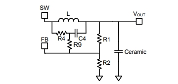 如果輸出電容具有足夠的等效串聯(lián)電阻(ESR),則由該ESR產(chǎn)生的反饋斜坡電壓主導(dǎo)電感的較小串聯(lián)電阻。在這種情況下,一個(gè)簡單的電阻分壓器網(wǎng)絡(luò)就足夠了 (參見圖5),通常可用于電解電容或POSCAP電容。