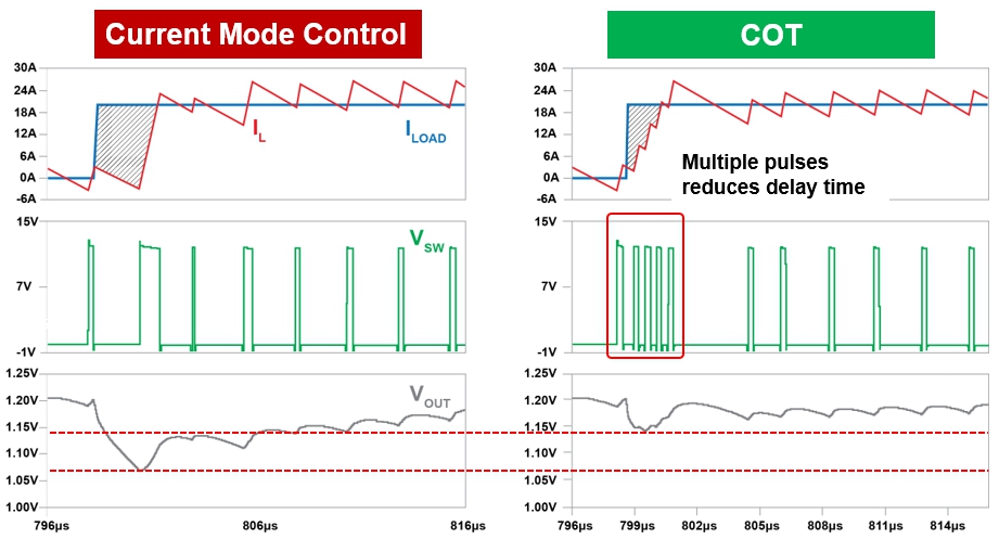 另外,COT控制的瞬態(tài)響應(yīng)時(shí)間比傳統(tǒng)的電壓或電流模式控制快兩倍。較低的下沖使它更容易滿足負(fù)載電壓公差規(guī)格。這也意味著,與電壓或電流模式變換器相比,基于COT控制模式的變換器需要更少的輸出電容便能滿足給定的負(fù)載瞬態(tài)響應(yīng),既節(jié)省了空間尺寸又節(jié)約了成本。