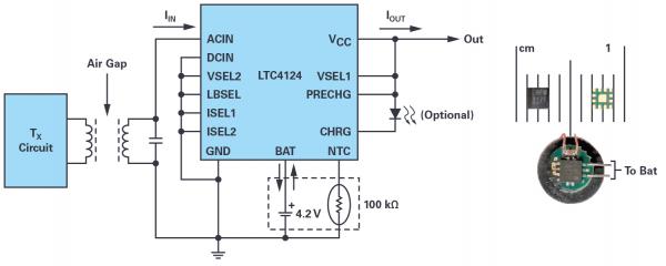 對于小尺寸便攜式和可穿戴設備而言,無線充電正變得越來越流行。這不足為奇。設備沒有裸露的連接器和端口將更加可靠,最終用戶體驗也更輕松簡便。為了克服這些設備(如助聽器)帶來的空間限制問題,LTC4124集成了無線功率管理器,它將來自無線諧振電路的交流電壓轉(zhuǎn)換為穩(wěn)定的直流電壓。然后,該直流電壓會饋入功能齊全的線性電池充電器中,以提供良好的電池充電功能。有著如此高的集成度,僅需添加一個接收器諧振電路和電池本身,即可實現(xiàn)非常小巧且功能齊全的無線充電裝置。
